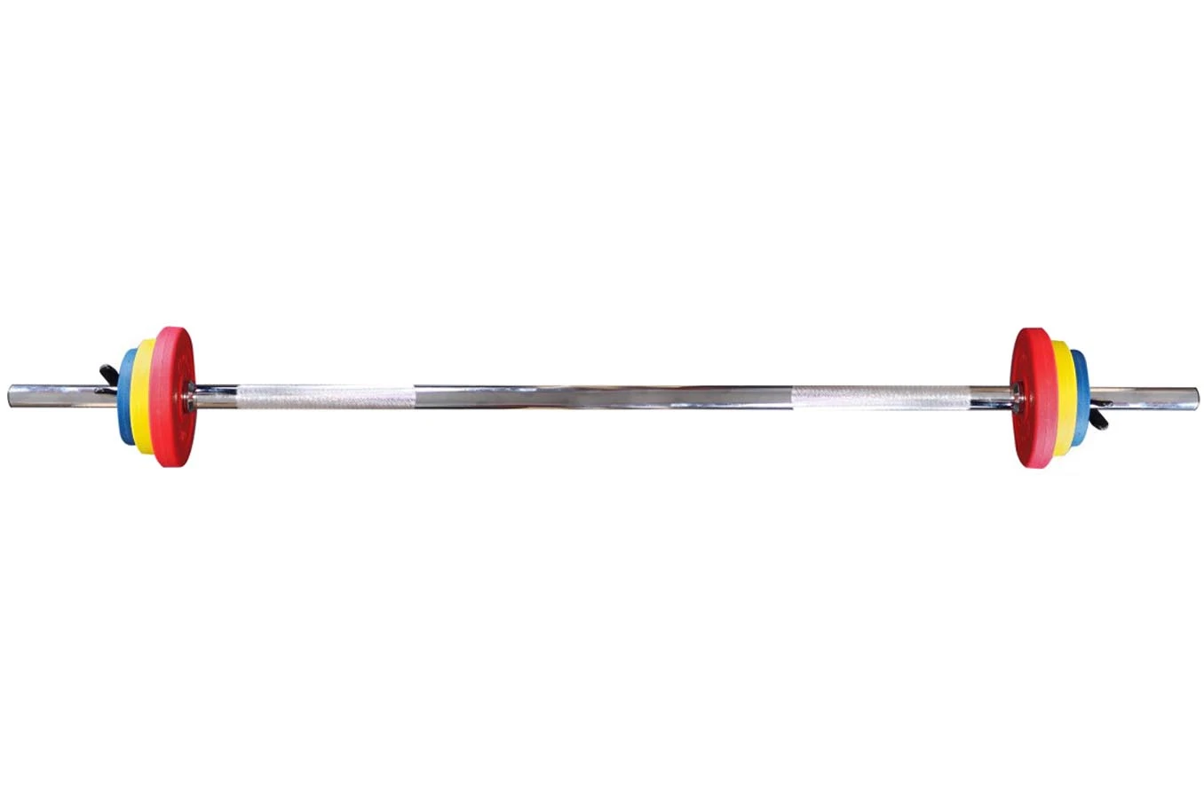 Cette barre de musculation olympique de 130 cm en acier chromé est fournie avec ses 2 stop disques à embouts plastifiés. Elle convient à des disques d’un diamètre de 28 mm.