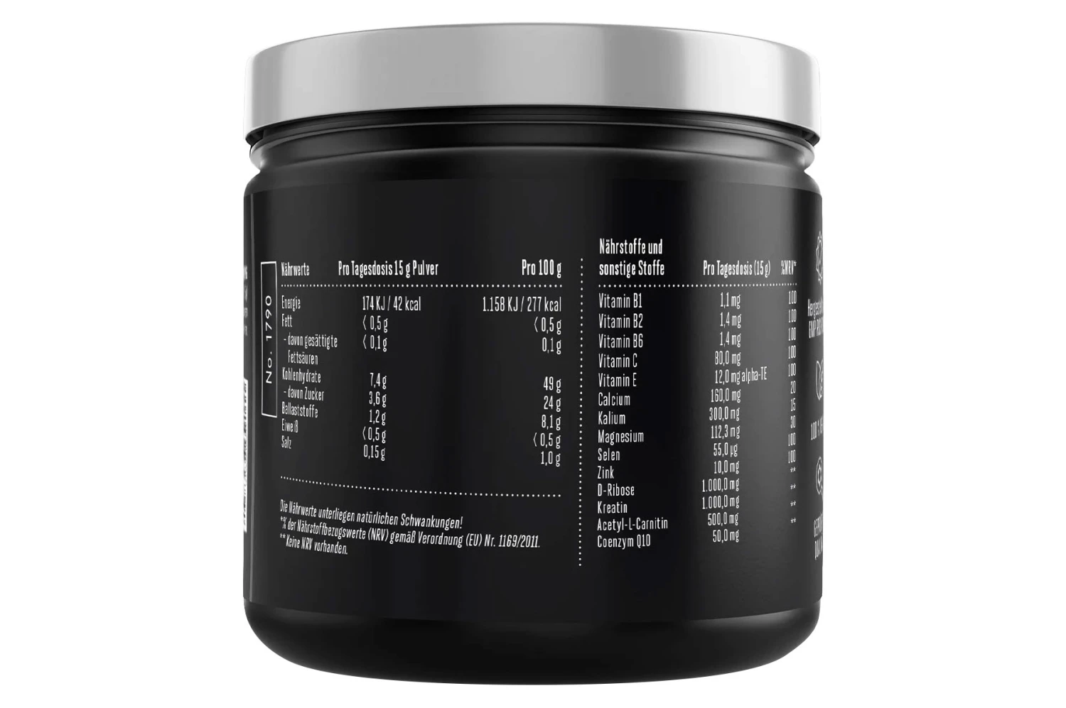 amidon, dextrose, maltodextrine, poudre de fibres d’acacia (80 % fibres alimentaires), citrate de magnésium potassium, créatine monohydrate 7,6 %, arômes naturels, D-ribose 6,7 %, acidifiant : acide citrique, sels de magnésium de l’acide citrique, acétyl-L -chlorhydrate de carnitine 3,9 %, eau de coco en poudre, carbonate de calcium, sel de table, colorant : bêta carotène, L-ascorbate de calcium, coenzyme Q10 0,3 %, picolinate de zinc, acétate de D-alpha tocophéryle, édulcorant : sucralose, anti-agglomérant : silicium dioxyde de carbone, chlorhydrate de pyridoxine, chlorhydrate de thiamine, riboflavine, sélénite de sodium.