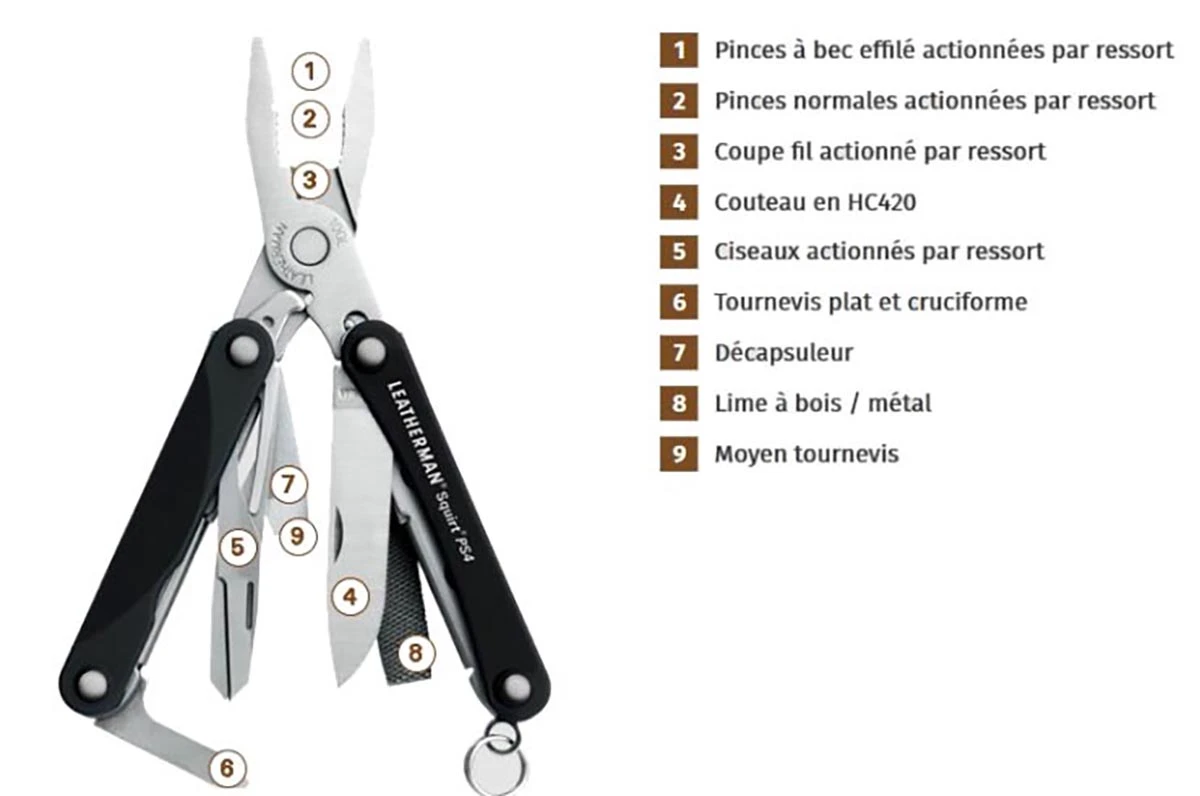 Couteau Suisse Leatherman Squirt PS4 comprenant 9 outils différents pour un outillage sans encombrement à portée de main, idéal pour un usage domestique, randonnées, ballades…