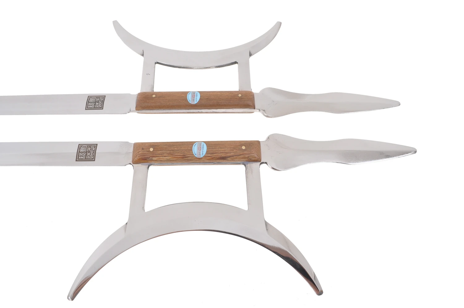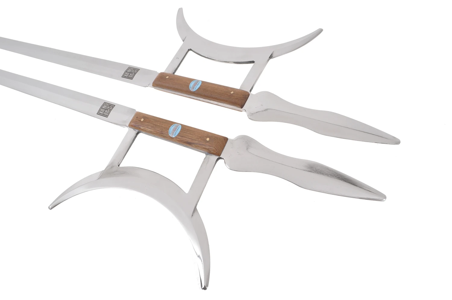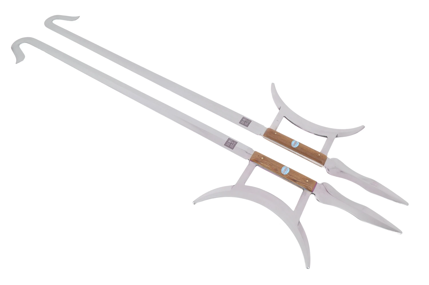 Crochets de très bonne qualité avec de belles finitions, en acier inoxydable, rigides, avec poignées en bois. Fabriqué par la forge Jian Wang, haut de gamme des produits Kung Fu en Chine.
