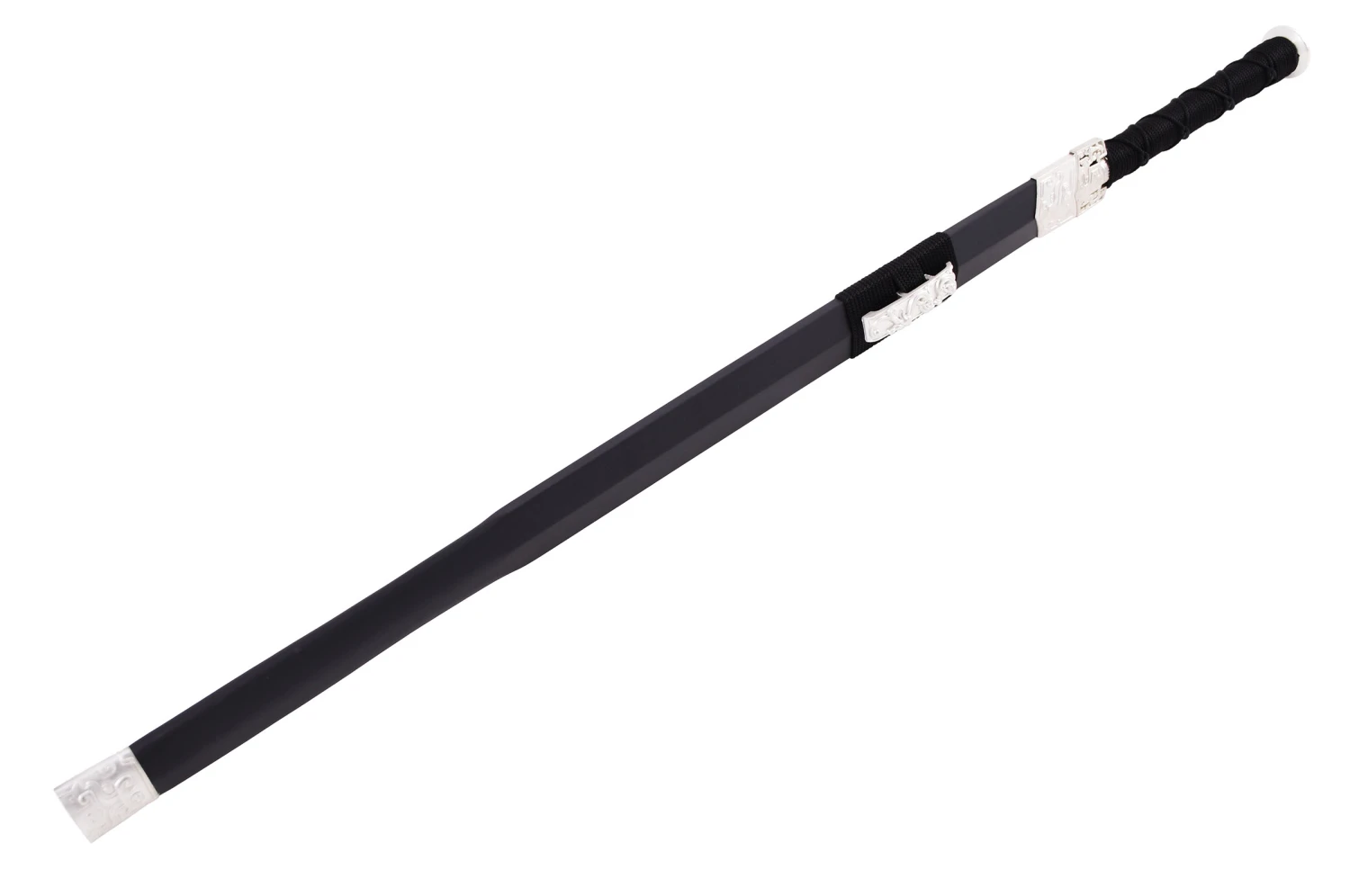 Épée avec fourreau noir, et pièces ornementales en métal blanc et lame noire avec motif doré.