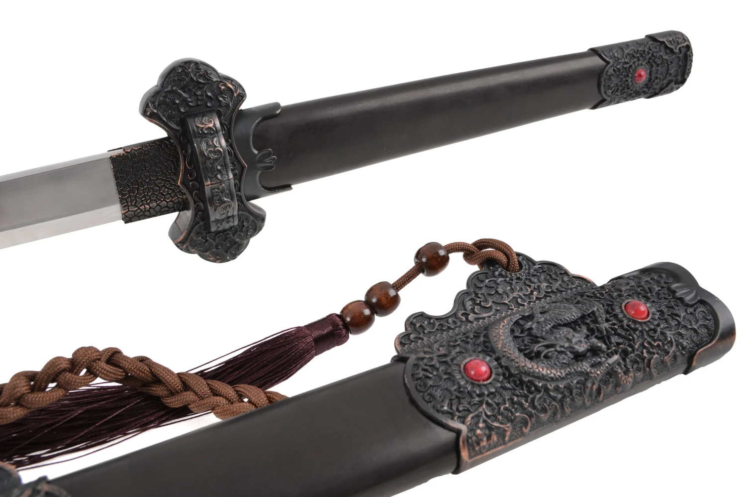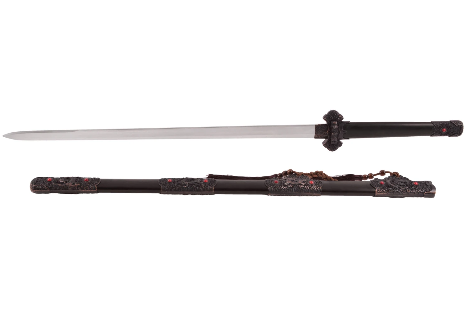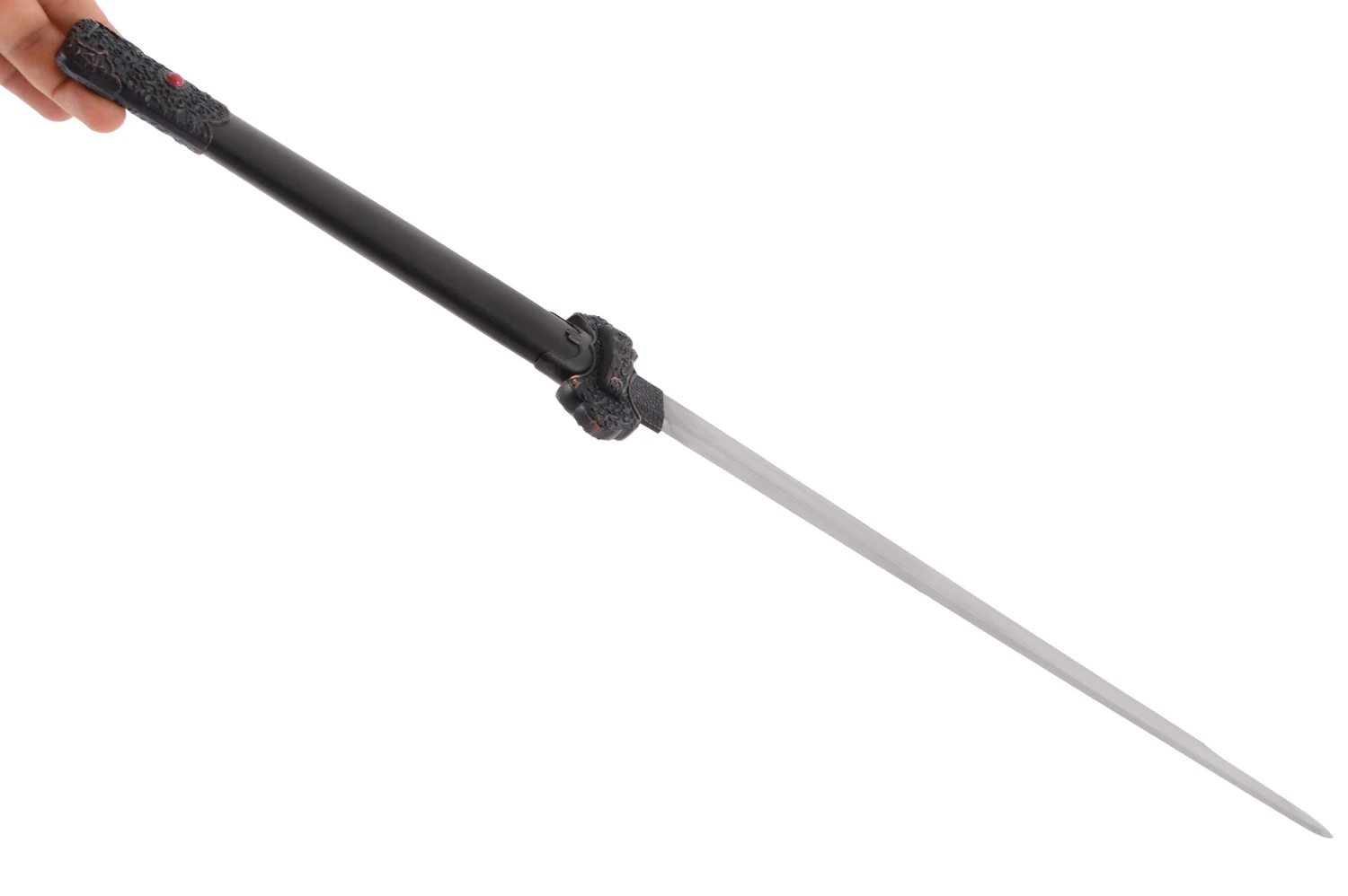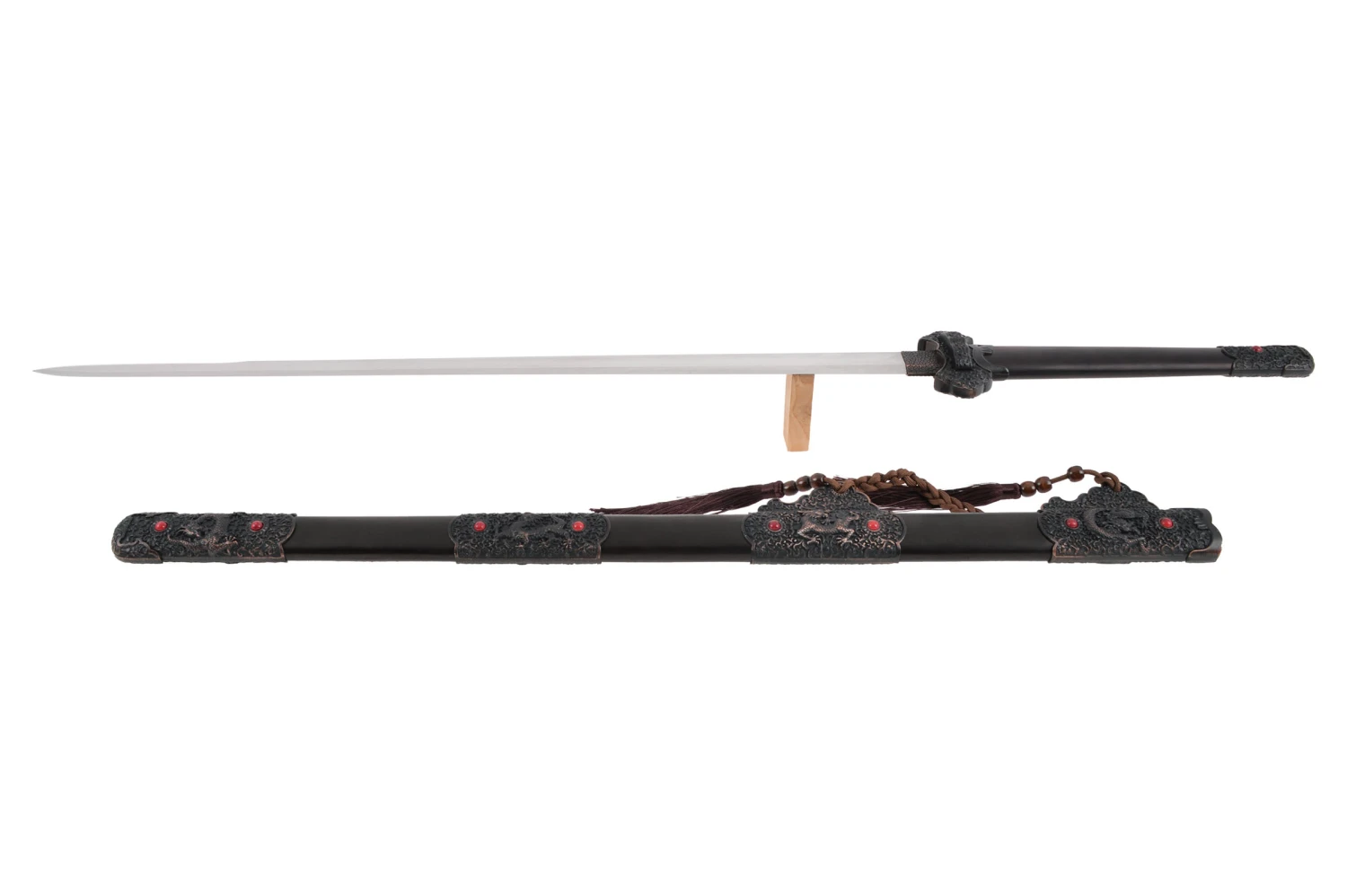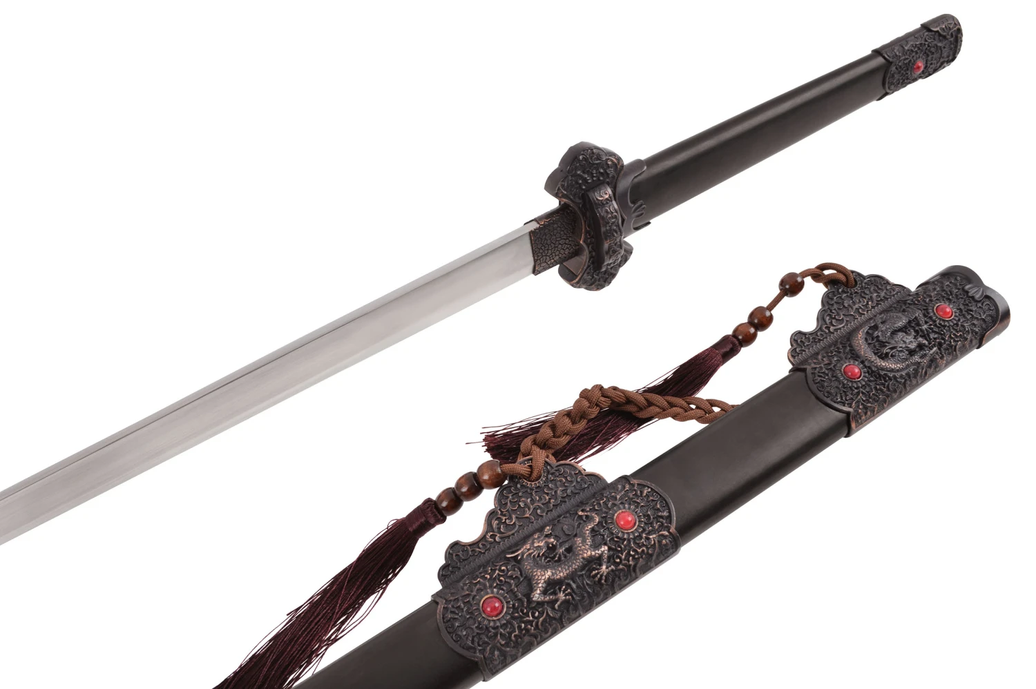 La lame est en double tranchant sur le dernier tiers, le reste de la lame à un revers épais pour assurer une parfaite rigidité et accroitre sa solidité. Cette épée est une réplique d’une lame traditionnelle chinoise, relativement lourde avec un rapport qualité/prix inégalé sur le marché.
