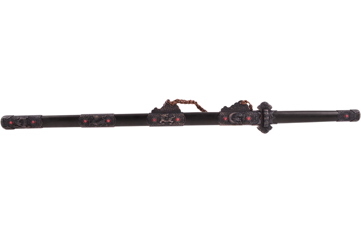 Avec des pièces finement travaillées et un fourreau laqué incrusté de perles rouges. Le fourreau est parfaitement adapté à la lame.