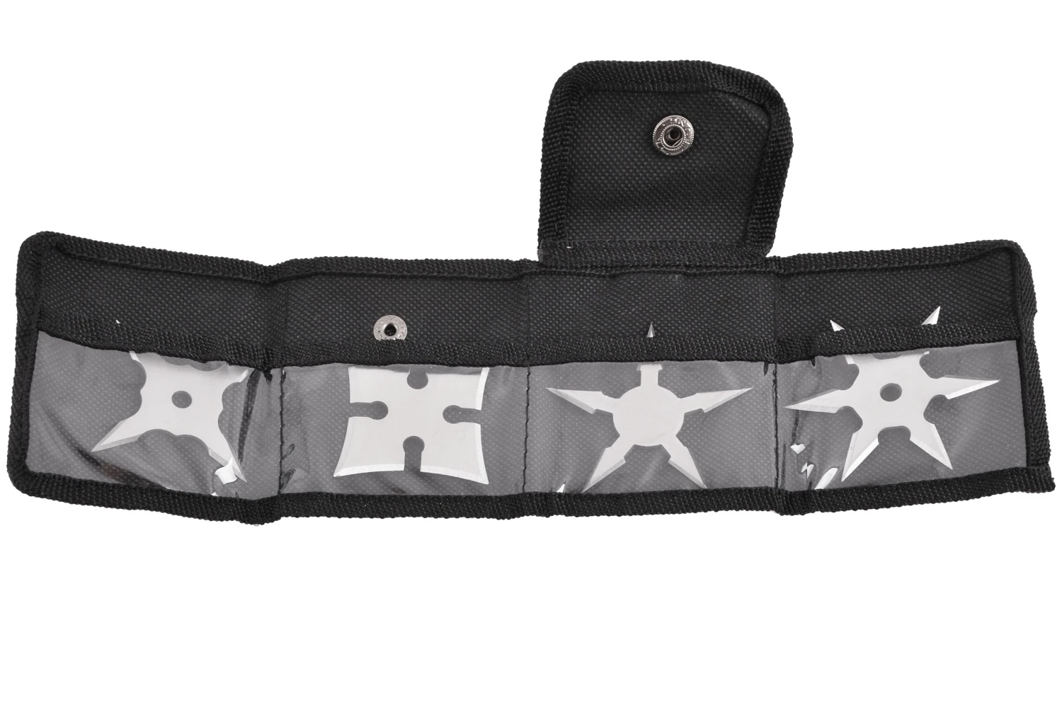 Lot de 4 Étoiles de Ninja miniature en acier de formes différentes de 4 à 6 branches, vendues avec une pochette de rangement.