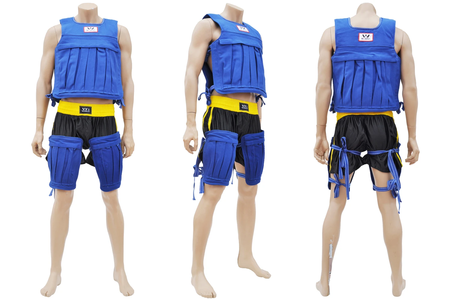 Chaque jambière peut contenir 5 poches à poids et la veste peut contenir 14 poches à poids (7 devant et 7 derrière).