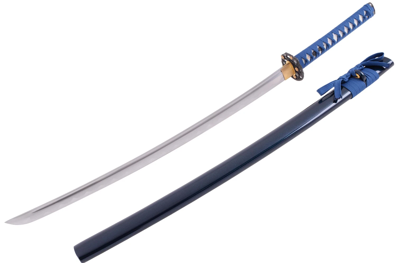 Ce katana possède une lame à gorge aiguisée, un manche tressé bleu roi avec en-dessous un tissu en peau de raie blanc sur lequel est fixé un Komainu noir (Lion gardien issu de la culture japonaise), une garde (Tsuba) argent et or décorée de fleurs et un magnifique fourreau (Saya) en bois bleu laqué.