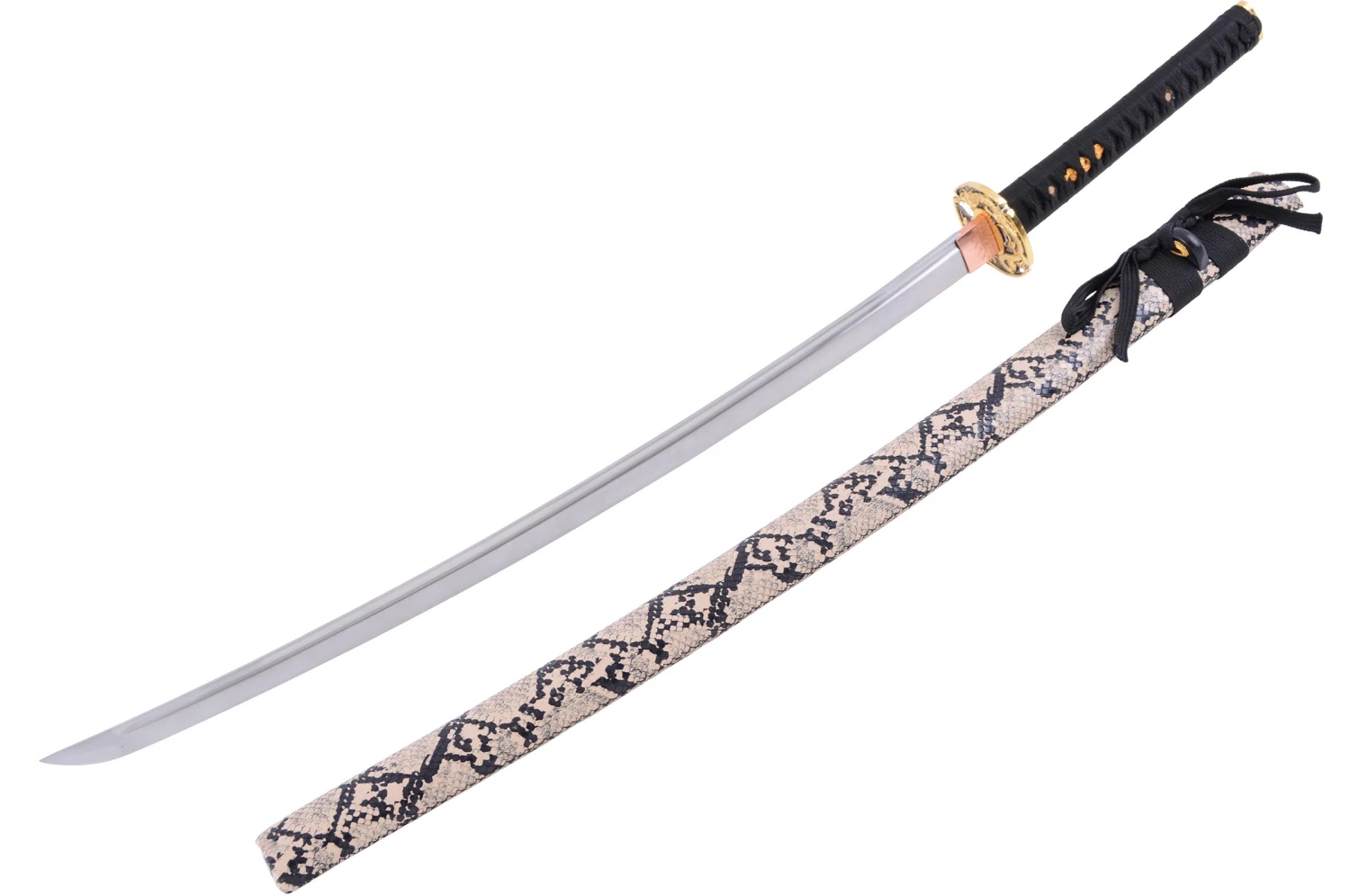 Ce Katana possède un magnifique fourreau (Saya) en bois avec un revêtement résistant motif écailles de serpent noir et beige.