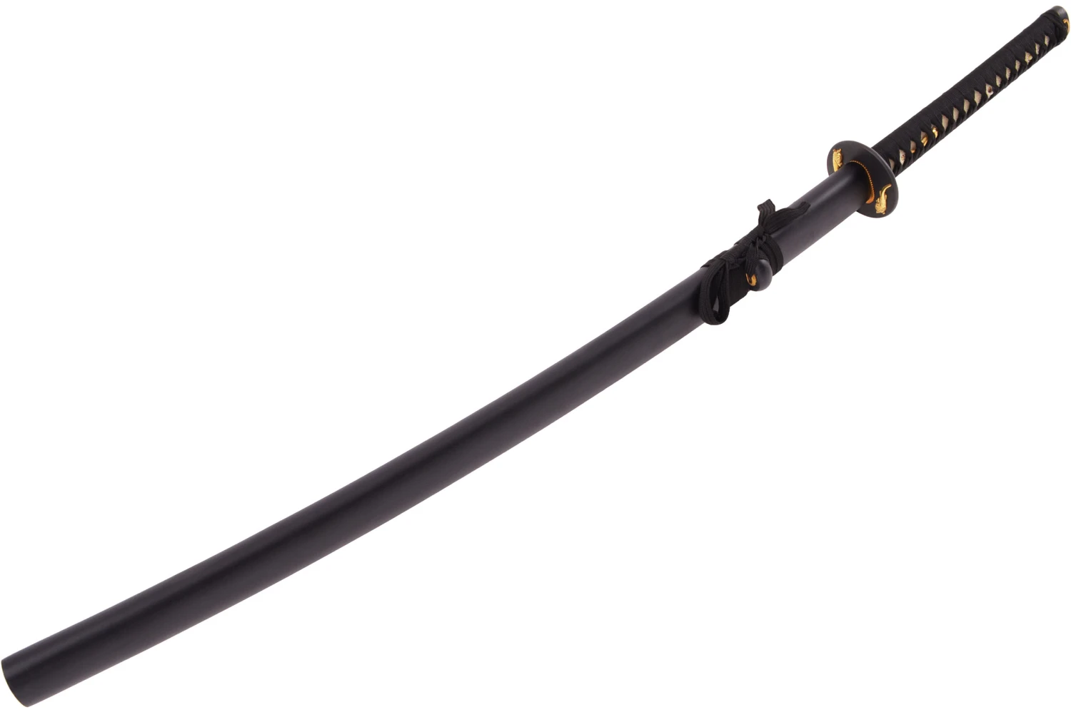 Ce katana possède une lame à gorge aiguisée Maru, un manche au tressage noir, une garde (Tsuba) en acier noir mat décoré de deux salamandres dorées et un magnifique fourreau (Saya) en bois et résine noir mat.