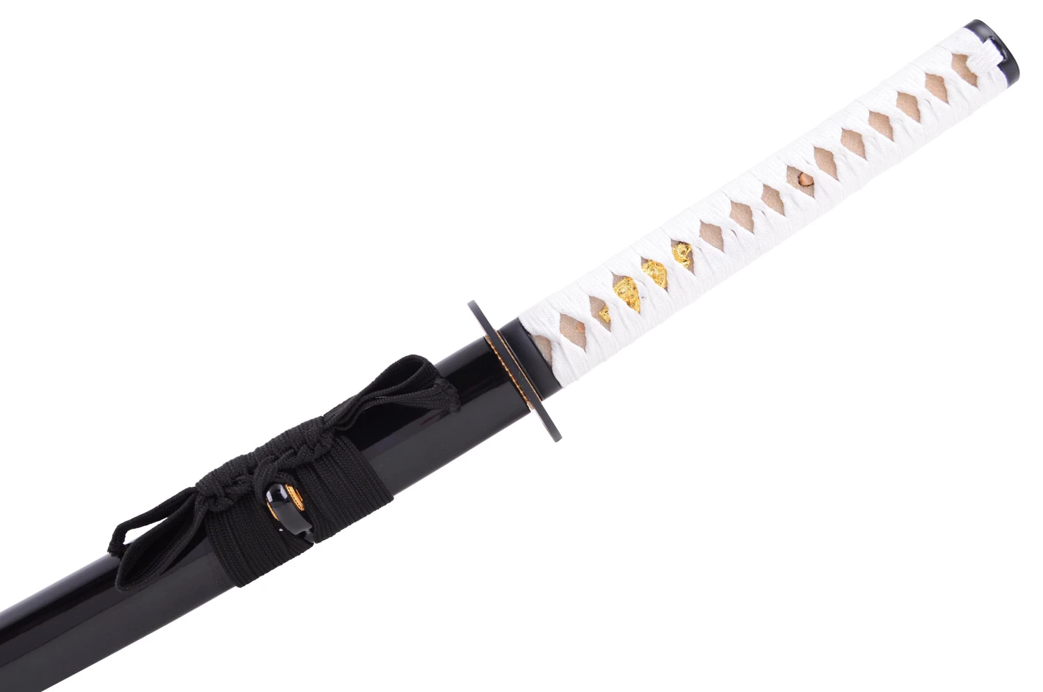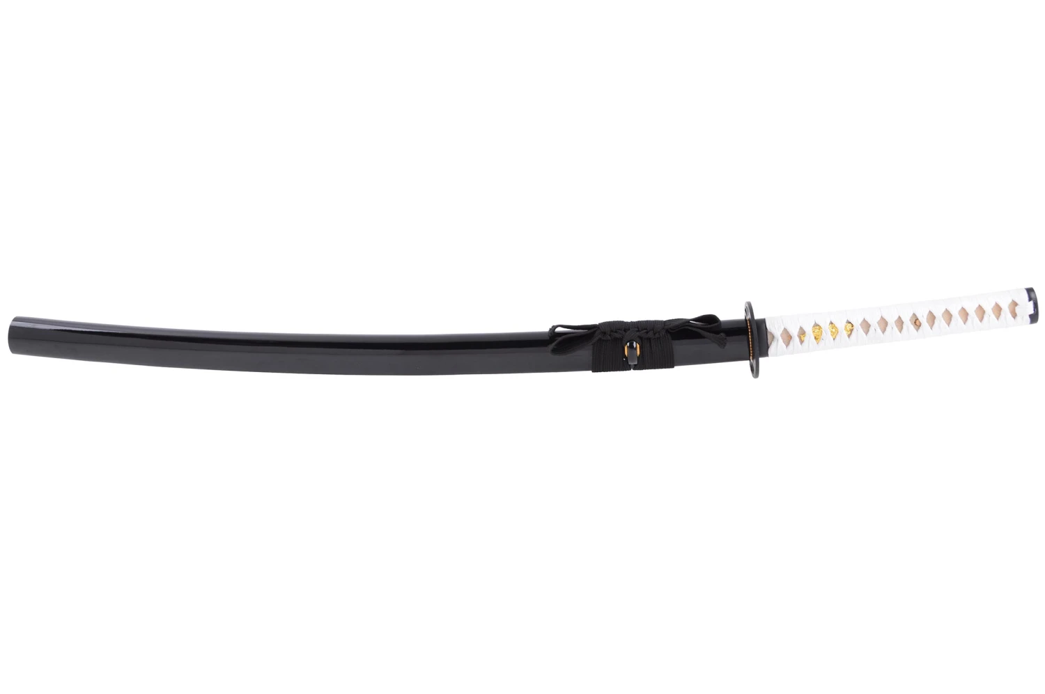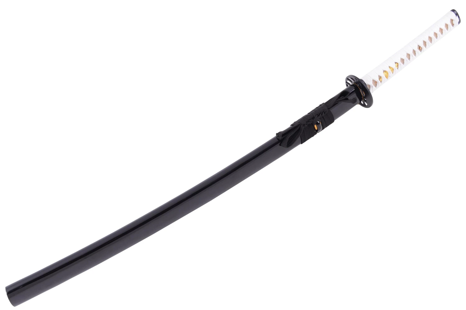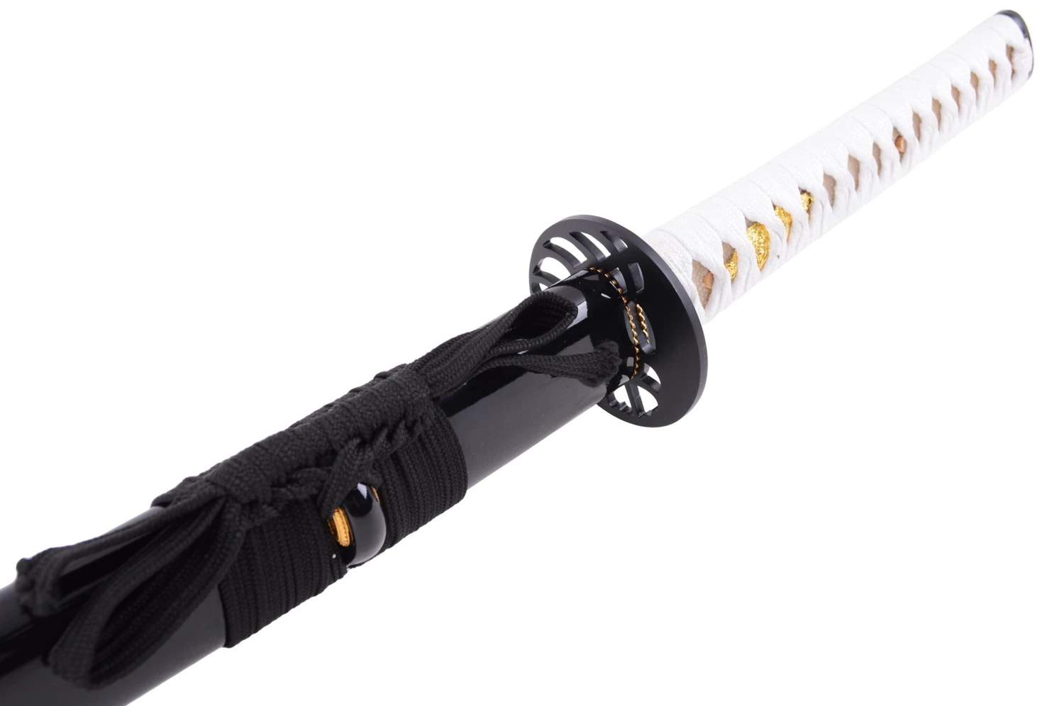 Ce katana possède une lame à gorge aiguisée, un manche tressé blanc avec en-dessous un tissu en peau de raie beige sur lequel est fixé un Komainu doré (Lion gardien issu de la culture japonaise), une garde (Tsuba) noire sculptée en forme d’ailes d’oiseaux et un magnifique fourreau (Saya) en bois laqué noir.