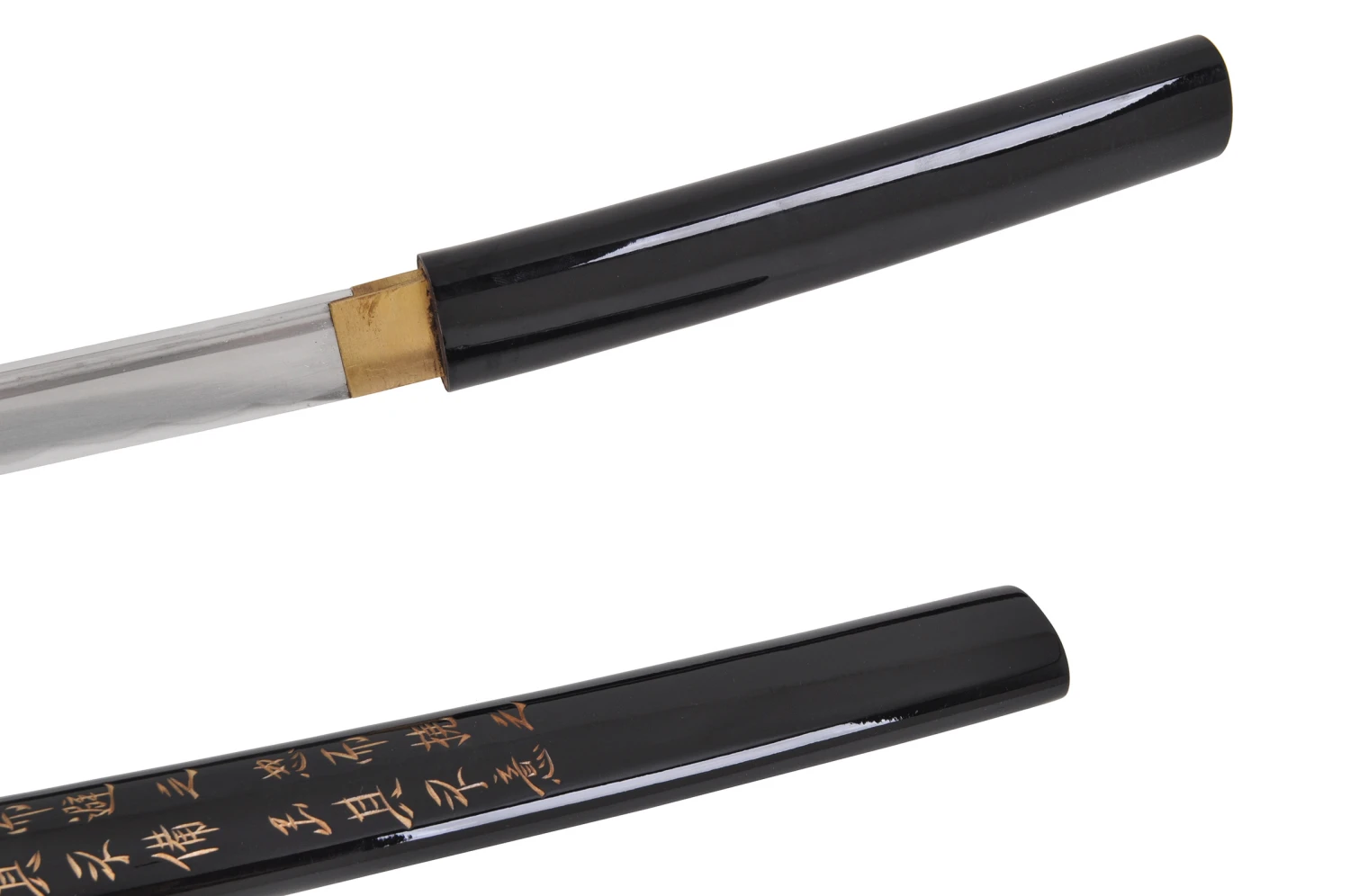 Katana sans garde à lame courbée avec poignée et fourreau en bois noir laqué avec des inscriptions gravées à la main qui reprennent un poème de l’œuvre « l’art de la guerre » de Sun Tzu.
