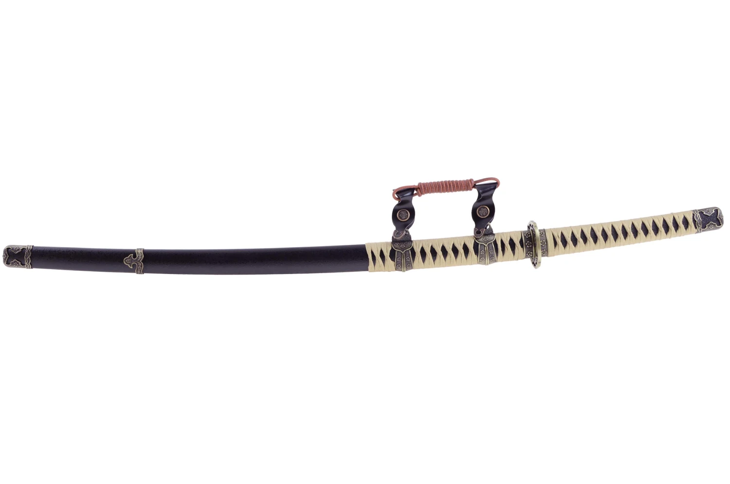 Ce Tachi à lame aiguisée possède un manche tressé beige, une garde dorée et noire hexagonale légèrement arrondie avec des motifs fleuris finements travaillés, un fourreau (Saya) en bois laqué noir effet texturé avec un magnifique tressage beige et un Koshirae marron et noir aux inclusions de détails dorés.