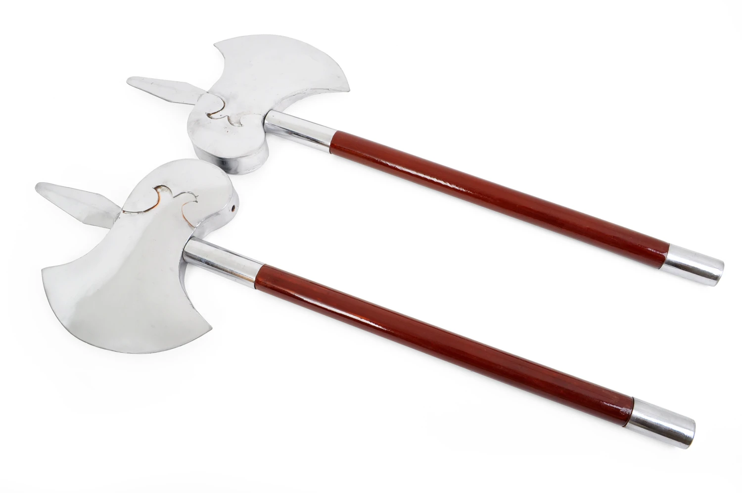 Arme courte traditionnelle très puissante, s’utilise par paire. Se démonte en 3 parties (manche, tête et pointe). Parties métalliques rigides en acier chromé, manche en bois.