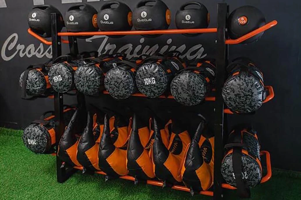 Ce rack orange et noir permet de stocker différents poids comme des wall balls, des sandbags ou encore des medecine balls. Ce rangement permet d’optimiser votre espace de sport.