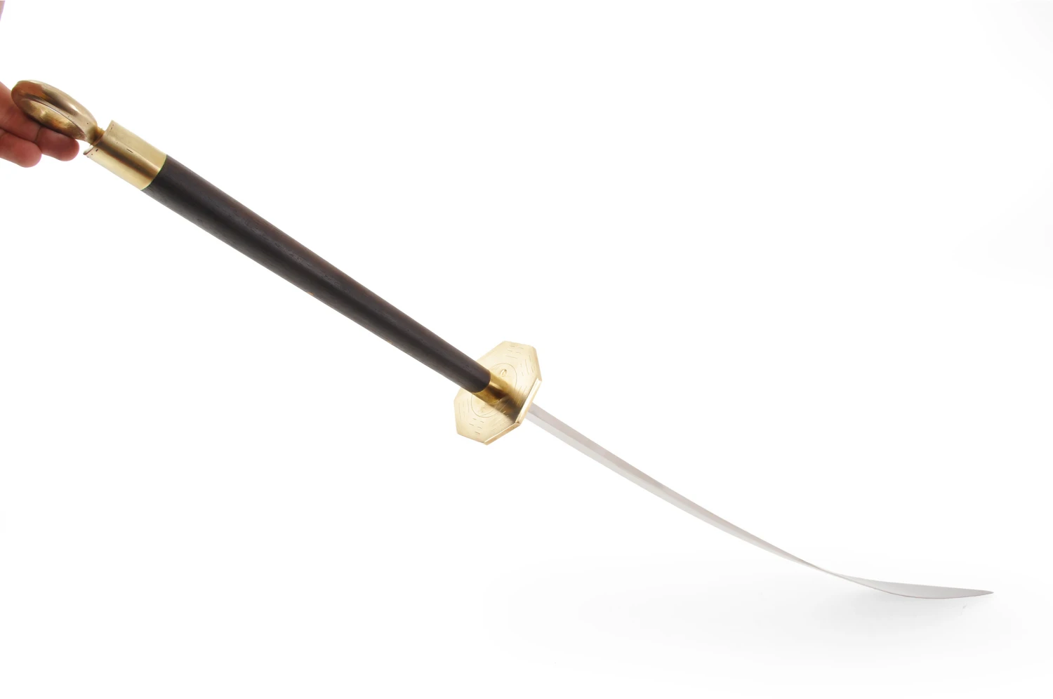 Grand sabre à lame en acier forgé très résistant, conçu pour la pratique du «Ba Gua Dao» ou «Ba Gua Qian Kun» (Sabre, style interne). Réalisé par une forge de Longquan. Un matériel de très haute qualité, destiné aux pratiquants les plus exigeants et expérimentés. La poignée en bois fin, garde travaillée aux motifs du Bagua.
