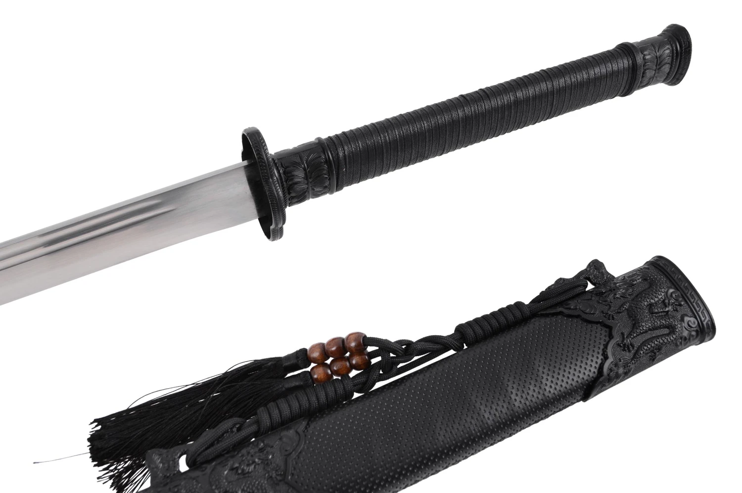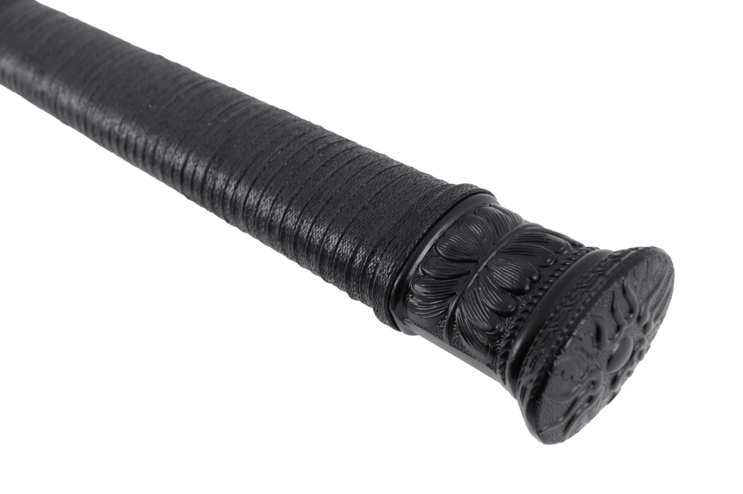 Son fourreau noir est recouvert d’une fine couche en simili cuir piqué et décoré de 3 parties ornementales aux dragons qui crachent leurs flammes. Il est, comme il se doit, embelli d’une corde et deux pompons avec des perles marrons, accrochées à leurs « kurigata » en forme de dragon.