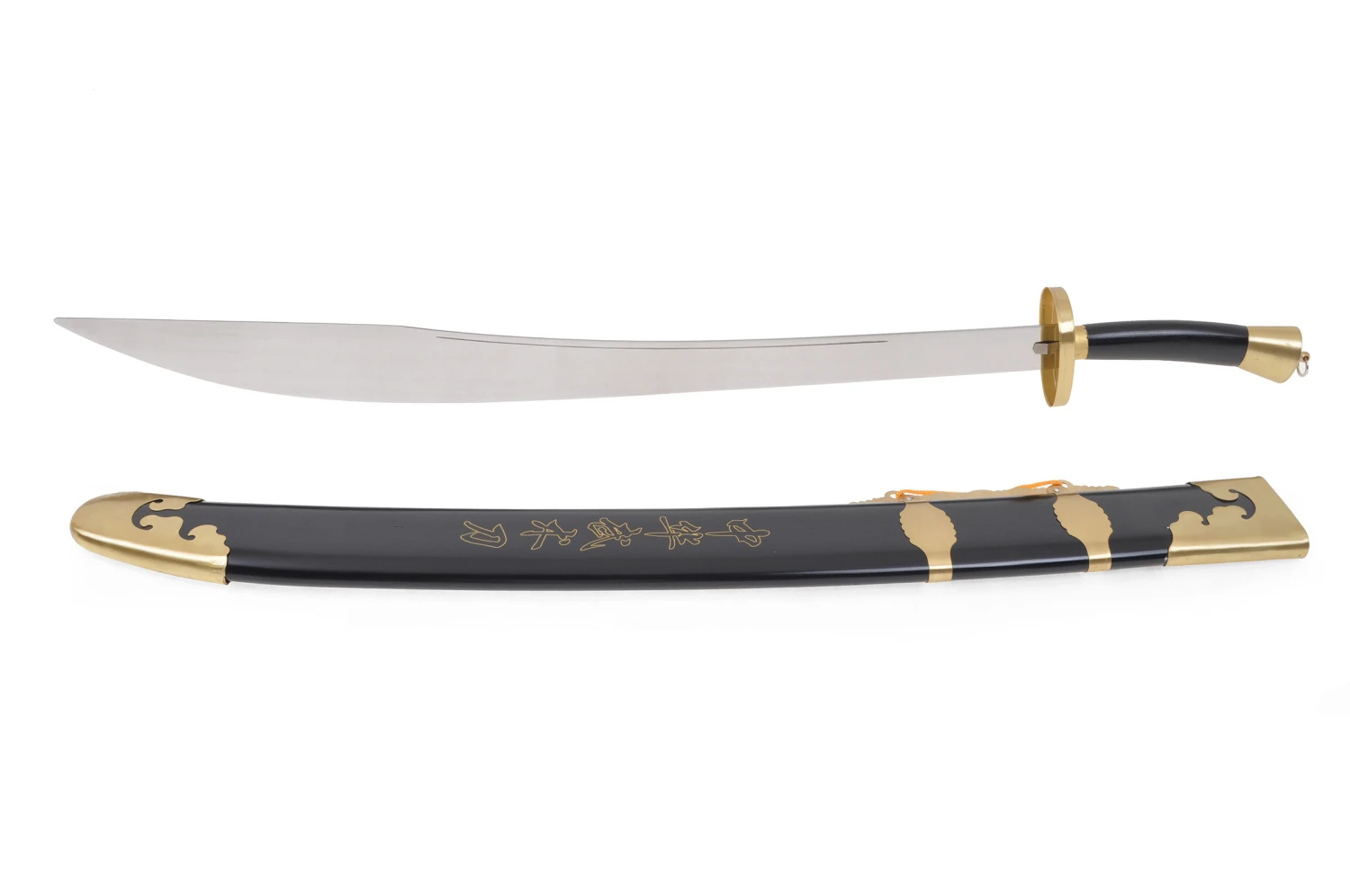 Sabre de bonne facture, robuste et agréable à manier. Parties cuivrées et laquées, fourreau laqué en noir, dragon gravé sur une face et « Zhong Hua Wu Shu Dao » sur l’autre face. Sabre léger et équilibré, est conçue pour la pratique du Wushu traditionnel. Un matériel adapté à l’entraînement quotidien, la semi flexibilité peut varier quelque peu entre les arrivages.