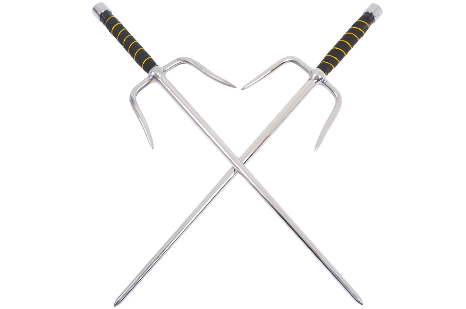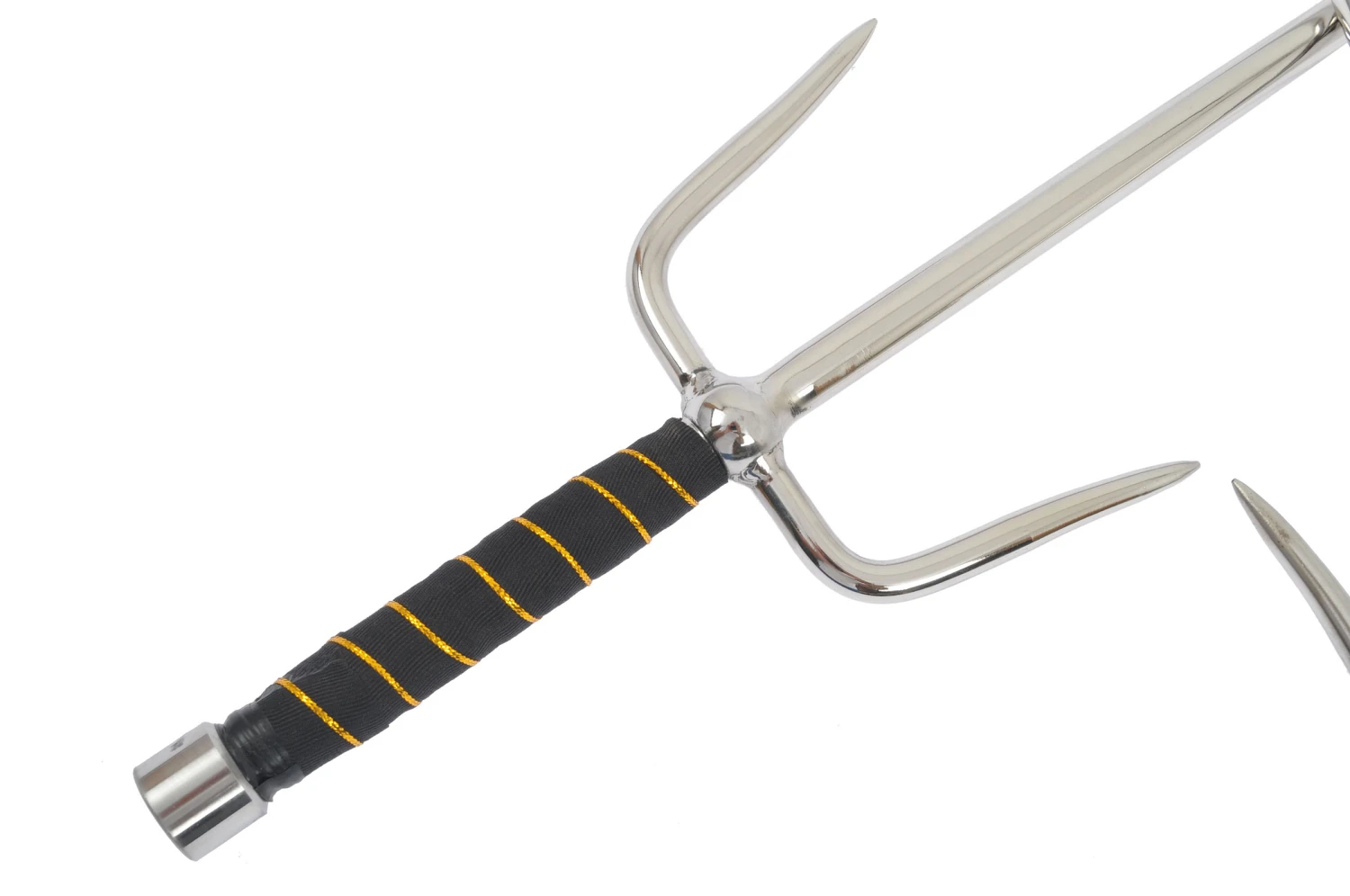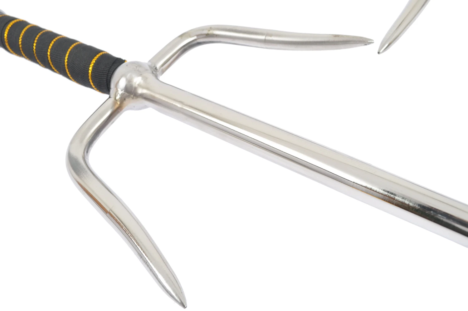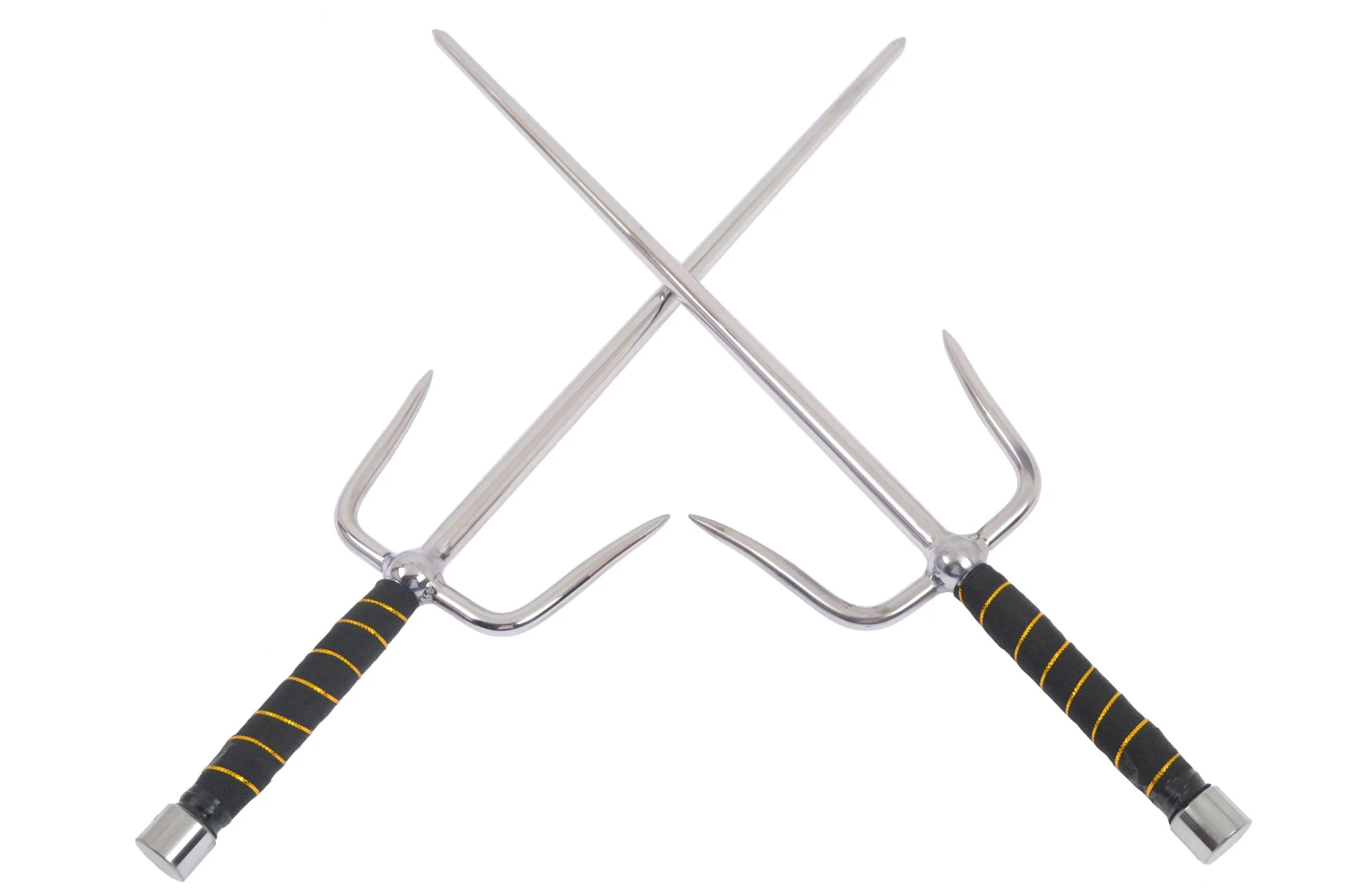 En acier inox, cette arme permet à la fois de défendre efficacement en bloquant les armes de l’adversaire, et d’attaquer avec une des trois pointes. Particularité d’avoir une section ronde, ce qui peut être recherché pour un travail particulier.